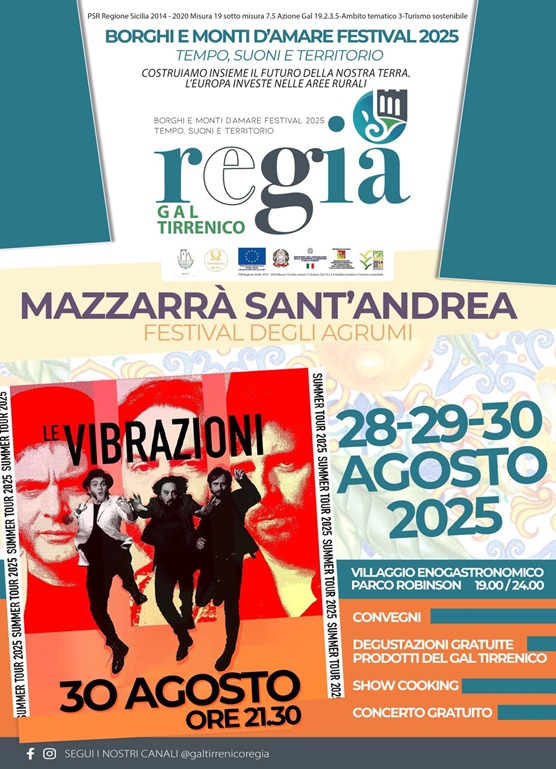 Dopo uno strepitoso inizio di tappa di Lipari con “Eolie in classico” e con il Cooking Show dello chef di fama internazionale Lucio Bernardi del prestigioso “Ristorante da Filippino”, “Borghi e Monti d’aMare Festival 2025”, firmato Gal Tirrenico Mmb, arriverà al suo ricco epilogo con la tappa di Mazzarrà Sant’Andrea dal 28 al 30 agosto, inserendo come finale col botto del 30 agosto a Largo Manzoni il concerto della band Le Vibrazioni guidata dal leader Francesco Sarcina e una tre giorni di Festival degli Agrumi con angoli di riflessione sul territorio ed enogastronomia. Il cartellone artistico ha voluto chiudere in bellezza con una formazione che ha fatto la storia della musica, vincitrice anche di disco di platino che ha infervorato le piazze e l’amore con lo stile del rock.