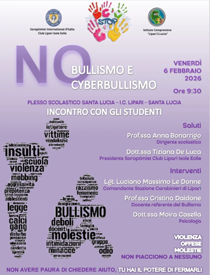 Domani, venerdì 6 febbraio, su iniziativa del Club Soroptimist delle Eolie, l’Istituto Comprensivo “Lipari S. Lucia” ospiterà un importante momento di riflessione e confronto dedicato ai nostri studenti. Insieme a esperti del settore e rappresentanti delle istituzioni, approfondiremo le dinamiche di questi fenomeni per imparare a riconoscerli, contrastarli e costruire una comunità scolastica basata sul rispetto.