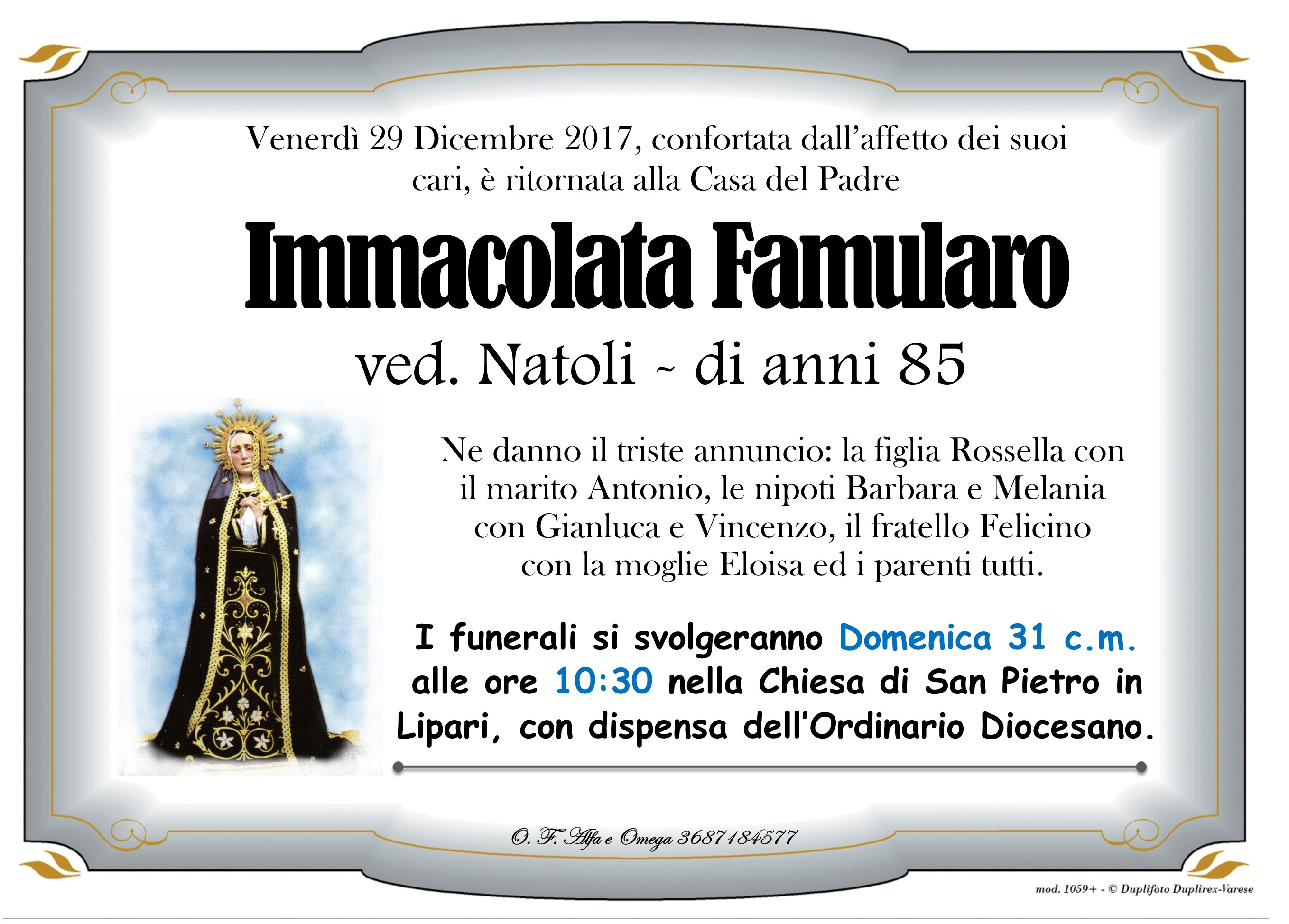<a href="https://www.giornaledilipari.it/wp-content/uploads/2017/12/11-A-Madonna-Addolorata-senza-foto-Famularo-Immacolata.jpg"><img class="aligncenter size-large wp-image-50074" src="https://www.giornaledilipari.it/wp-content/uploads/2017/12/11-A-Madonna-Addolorata-senza-foto-Famularo-Immacolata-1024x734.jpg" alt="11- A Madonna Addolorata senza foto (Famularo Immacolata)" width="1024" height="734" /></a> <em><strong>Ai familiari le più sentite condoglianze del Giornale di Lipari</strong></em>