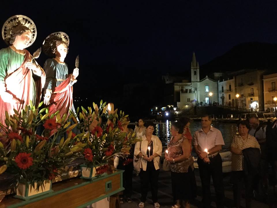 Lipari- Nelle foto di Antonio Iacullo alcuni momenti di ieri sera, a Marina Corta, per la festa dei Santi Cosma e Damiano con la processione verso la chiesetta della penisola del Purgatorio e la successiva Sagra del Pesce con intrattenimento musicale a cura dei Soundsgood. La manifestazione come ogni anno, è organizzata in collaborazione con don Giuseppe Mirabito, dall’associazione Santi Cosma e Damiano impegnata con i contributi raccolti e il ricavato di un sorteggio premi a continuare le opere avviate di recupero della chiesetta delle Anime del Purgatorio divenuta negli ultimi anni una delle attrazioni dell’isola. Stasera dopo il giocho tradizionale de ” La Pentolaccia ” alle 18,00, e la degustazione di cannoli , serata danzante con gli ” Oxidia “.