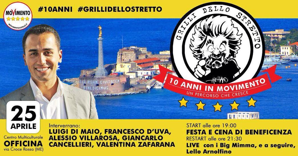 Oggetto: Il Meetup ” Milazzo in Movimento ” prenderà parte ed invita la cittadinanza a partecipare all’evento organizzato per festeggiare i dieci anni in MoVimento del Meetup ” I Grilli dello Stretto ” con Luigi Di Maio ed altri portavoce del Movimento 5 Stelle !!