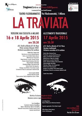 A Milano, il 16 e 18 aprile , per la prima volta “La Traviata” di G.Verdi nell’edizione di Venezia 1853 e il 17 aprile nella versione tradizionale ma per la prima volta per Voce all’Opera con costumi storici rivisitati. Gli spettacoli avranno inizio alle 20:30 al Teatro Filodrammatici. Tra i protagonisti il baritono liparese Giovanni Tiralongo ( papà Germont).