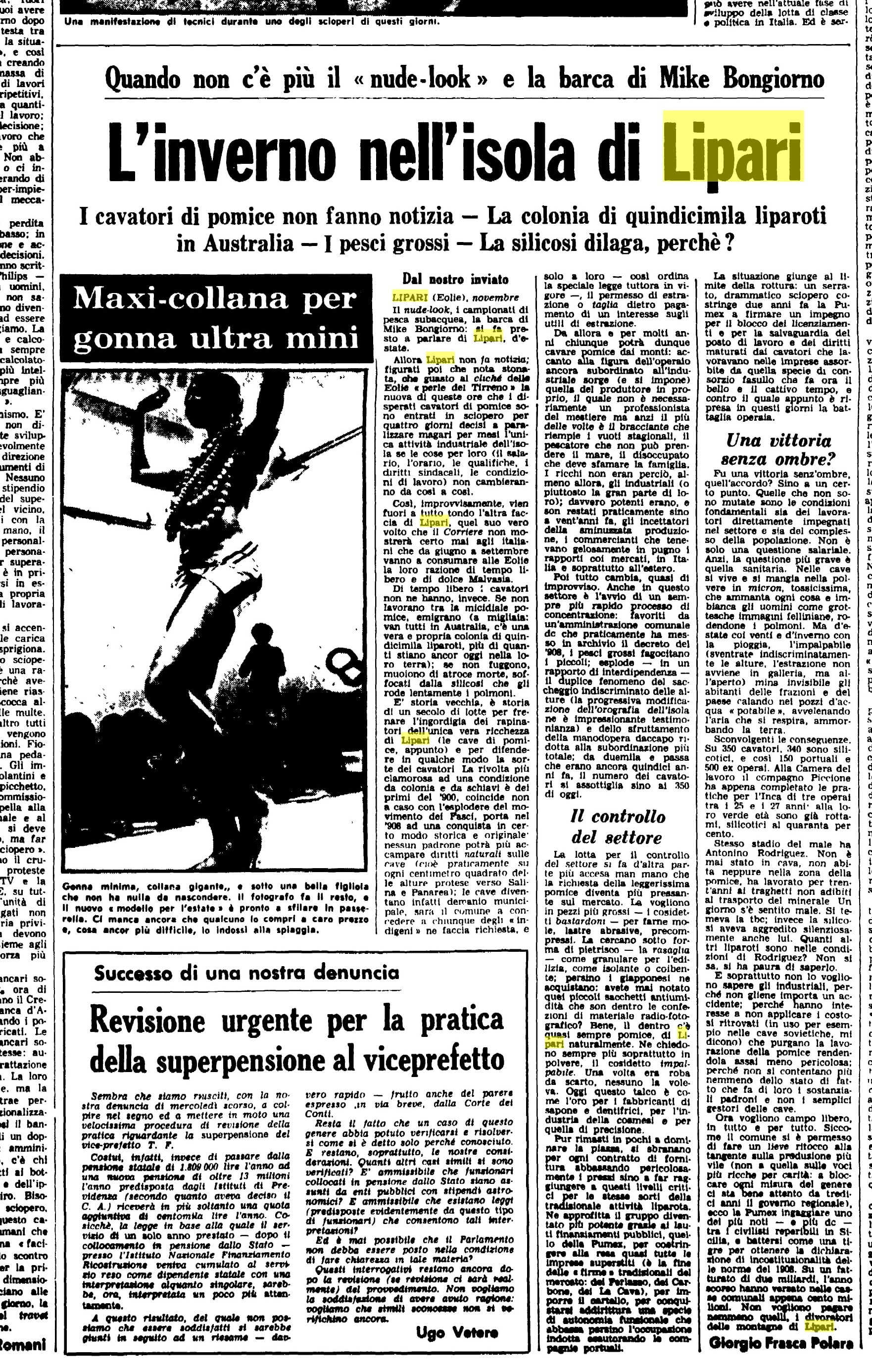 Fine novembre 1969. Prima pagina de l’Unità dedicata allo sciopero dei cavatori della pomice , alla fuga in Australia come alternativa  e al grosso problema della silicosi ( clicca e ingrandisci la foto)