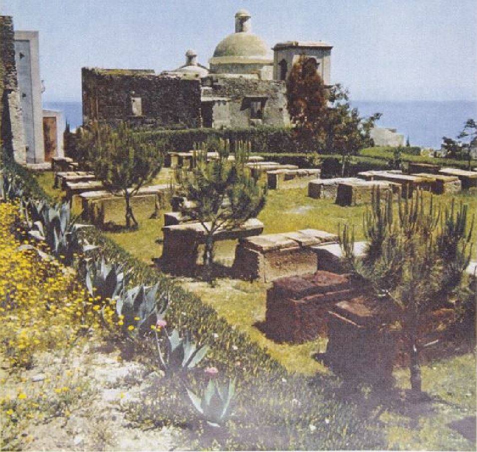 ” Lipari. La necropoli greco-romana sullo sfondo della chiesa della Madonna delle Grazie. Secondo lo schema che si ripete nelle Eolie le tombe sono formate da lastre di pietra lavica “.