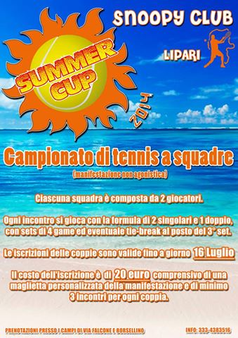 <p style="text-align: justify;">Lo Snoopy club organizza la "Summer Cup" 2014, un campionato a squadre non agonistico che si svolgerà nei mesi di luglio e agosto. Ogni squadra sarà composta da 2 persone. E' possibile iscriversi presso la sede dei campi in via Falcone e Borsellino.</p> <a href="https://www.giornaledilipari.it/wp-content/uploads/2014/07/summer-tennis.jpg"><img class="size-medium wp-image-10146 alignleft" alt="summer tennis" src="https://www.giornaledilipari.it/wp-content/uploads/2014/07/summer-tennis-211x300.jpg" width="211" height="300" /></a>