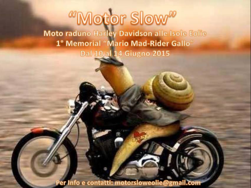 Dal 10 al 14 Giugno 2015, la Soc. Coop. “Mammafausa” e la Comunità “Lipari Isola Slow”, con la partecipazione di Bio Day Messina e di tante altre parterships “buone, pulite e giuste”, presentano il “Motor Slow – Raduno Harley-Davidson – 1° Memorial Mario Mad-Rider Gallo – Isole Eolie 2015″!