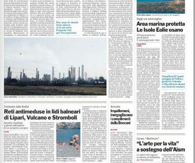 Sulla Gazzetta del Sud di oggi articoli sull’arrivo delle reti anti-meduse in tre lidi, rispettivamente a Lipari, Vulcano e Stromboli nell’ambito del progetto europeo ” Med-Jellyrisk” e sul convegno di questo pomeriggio , nella chiesa dell’Immacolata al Castello ” Un Parco marino nelle Eolie del mito” alla presenza del sottosegretario all’ambiente Silvia Velo.