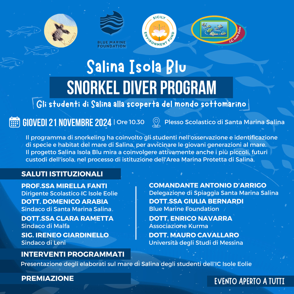 Organizzato grazie alle Associazioni BLU MARINE FOUNDATION, KURMA e UNIVERSITÀ DI MESSINA il Progetto si è svolto in tre momenti: Corso teorico-pratico di snorkeling, visita alla Area Marina Protetta di Capo Milazzo e convegno di diffusione risultati.