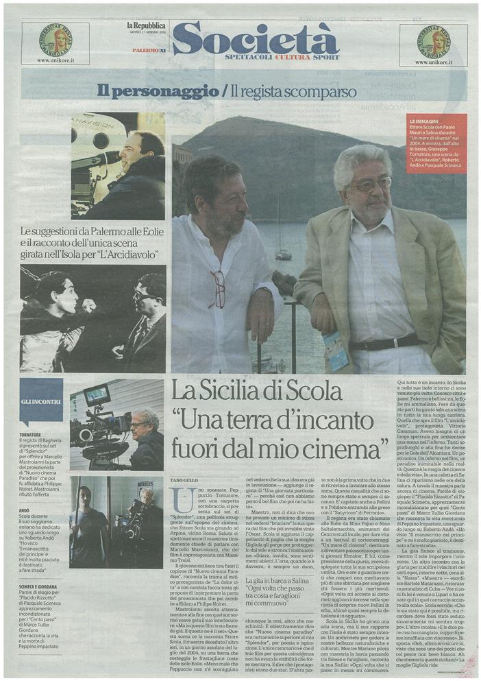 Nino Saltalamacchia del centro studi ci invia la foto dell’articolo di oggi su Repubblica con il quale Tano Gullo ricorda il Maestro Ettore Scola. Antonio Fiore rappresenterà il Centro Studi a Roma per i funerali . Il festival “Un mare di Cinema 2016” dedicherà un omaggio a Ettore Scola.
