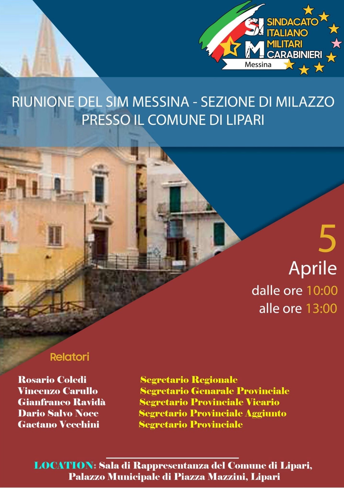 Riunione nella sala di rappresentanza del comune di Lipari del SIM Carabinieri ( Sindacato Italiano Militare Carabinieri). Tra i relatori anche il maresciallo Rosario Coledi , già in servizio a Lipari e il segretario generale provinciale Vincenzo Carullo. L’incontro, sul futuro dei sindacati all’interno dell’ arma dei Carabinieri oltre che sulle novità importanti a livello economico e contrattuale ma anche sui continui casi di femminicidio che purtroppo riempiono le pagine di cronaca.