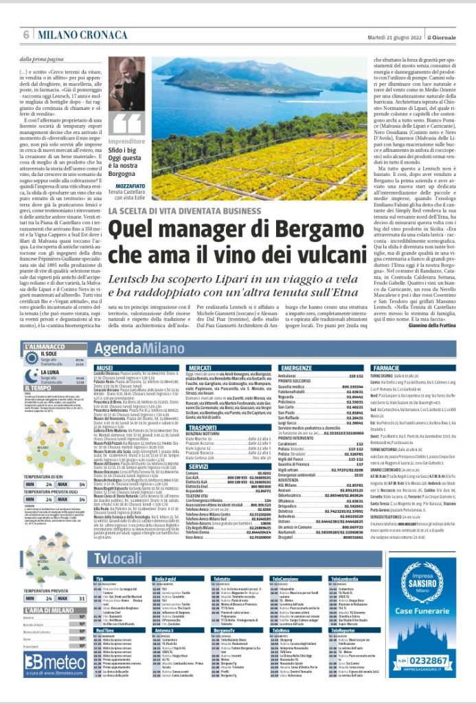 Nell’edizione di Milano de “Il Giornale” di oggi, in prima pagina, l’avventura ” da Bergamo ai vini nella Sicilia dei vulcani” dell’imprenditore Massimo Lentsch, fondatore della Tenuta di Castellaro a Quattropani. L’arrivo a Lipari in barca a vela , l’amore per l’isola che diventa scelta di vita e business e che valorizza un territorio.