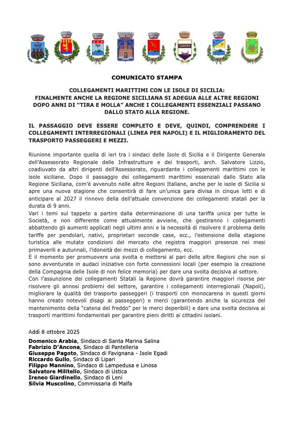 I Sindaci di Santa Marina Salina, Pantelleria, Favignana – Isole Egadi, Lipari, Lampedusa e Linosa, Ustica e Leni, insieme alla Commissaria di Malfa, hanno accolto con favore questa intesa che segna, come si legge nel comunicato, una “svolta decisiva” per i trasporti marittimi fondamentali.