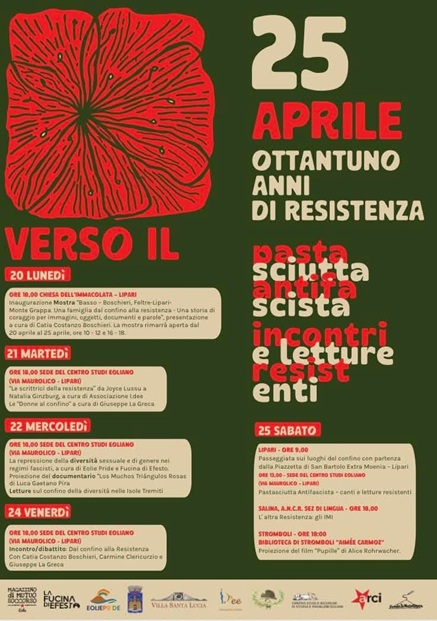 che attraverso tappa per tappa i più importanti luoghi di Lipari legati al confino e alla Resistenza, e che culminerà con la pasta asciutta antifascista, canti e letture resistenti.