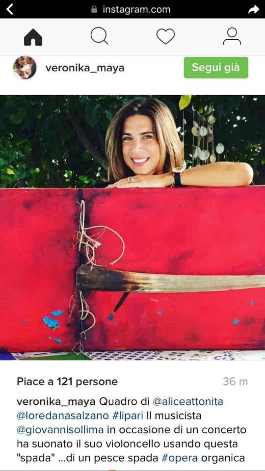 <h4 style="text-align: justify;"><a href="https://www.giornaledilipari.it/wp-content/uploads/2016/09/veronica-maya-salzano.jpg"><img class="alignleft size-medium wp-image-37630" alt="veronica maya salzano" src="https://www.giornaledilipari.it/wp-content/uploads/2016/09/veronica-maya-salzano-168x300.jpg" width="168" height="300" /></a>Veronica Maya radiosa nella sua dimora di Lipari con il quadro materico " XiphiasGladius" di Loredana Salzano saluta le Eolie<!--more--> anche per quest'anno: " state Attóniti > sempre ❤️ > ;) red passion > atelier LoredanaSalzano Lipari ".</h4> <a href="https://www.giornaledilipari.it/wp-content/uploads/2016/09/xiphias-gladius.jpg"><img class="alignright size-medium wp-image-37633" alt="xiphias gladius" src="https://www.giornaledilipari.it/wp-content/uploads/2016/09/xiphias-gladius-225x300.jpg" width="225" height="300" /></a>