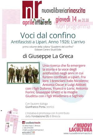 Il 14 aprile ha presentato presso la Libreria Rinascita di Brescia che annovera tra i soci Boretti Nicoletto, figlio di Itano (già confinato a Lipari negli anni trenta), il volume “Voci dal Confino, 1926 l’arrivo”. Lo storico eoliano e la produzione editoriale del Centro Studi sono state presentate dallo storico Gianfranco Porta; la serata è stata introdotta dalla promotrice degli appuntamenti la prof.ssa Nadia Tagliani con un intervento sulla Democrazia e la vita di Antonio Forini.